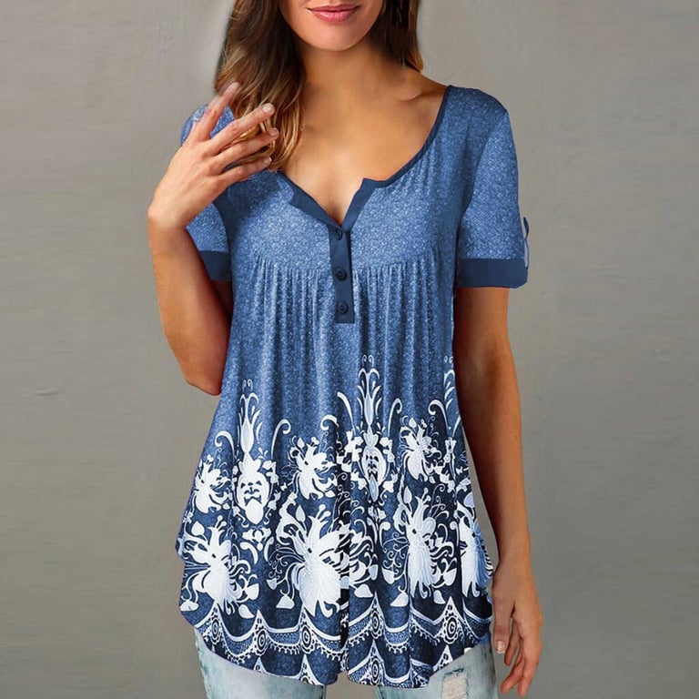 Women's tunic blouse with short sleeves. Loose longer cut with gathering. Round neckline with button fastening. Floral pattern print. Available in multiple colour options.