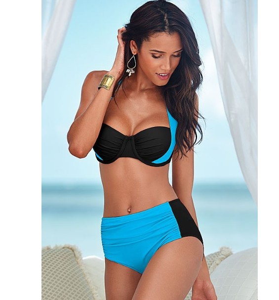 Women's two-piece high swimwear in black and light blue.