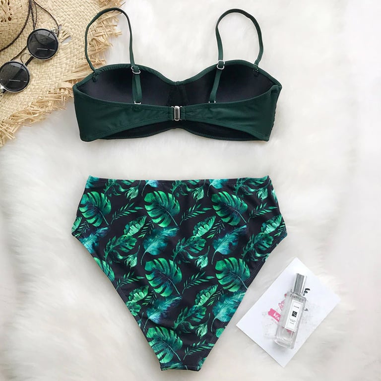 Women's two-piece swimsuit. The top features padded cups and narrow adjustable straps. The bottom has a high waist and a colourful pattern. Available in multiple variants.