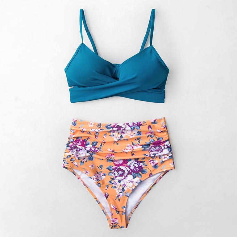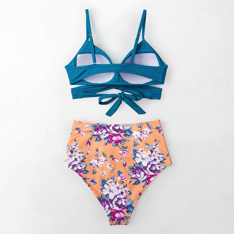 Women's two-piece swimsuit. The top features padded cups and narrow adjustable straps. The bottom has a high waist and a colourful pattern. Available in multiple variants.
