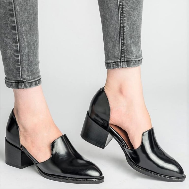 Women's open lace-up shoes on a wide heel. The shoes have a sturdy heel and cut-outs on the instep. Made of synthetic leather. Available in two colour options.