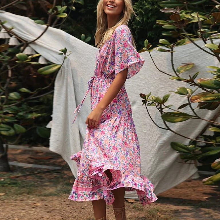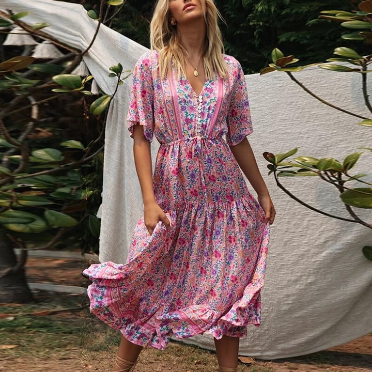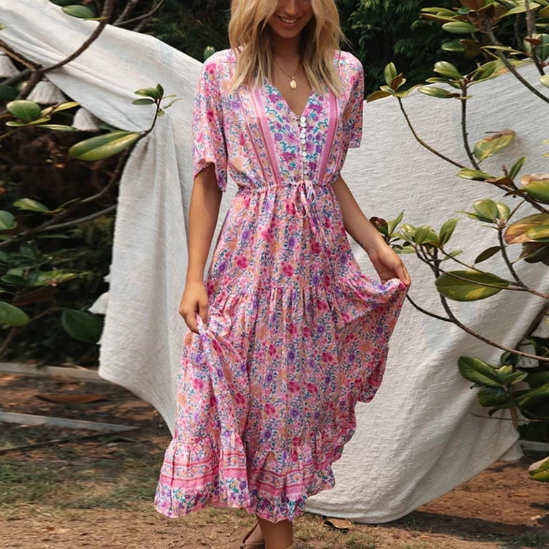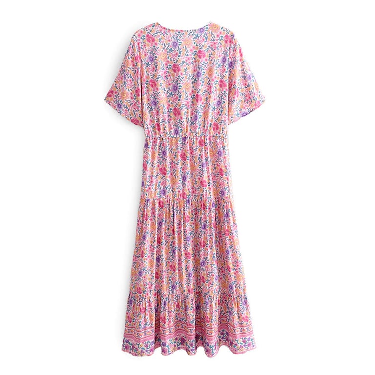 Women's Vintage Long Dress with Short Sleeves – Pink