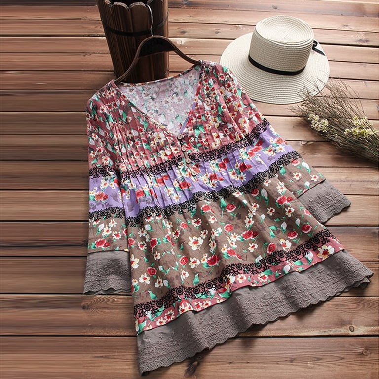 Women's loose-fitting blouse/tunic. The blouse features a V-neckline with button fastening. Floral print design. Plus size available. Available in several variations.
