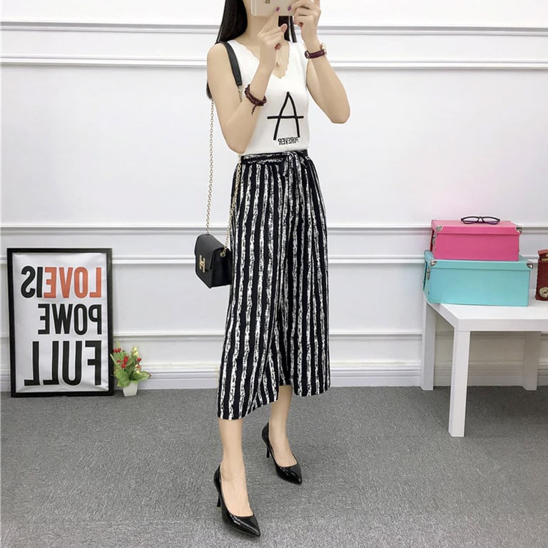 Women's high-waisted capri trousers. Three-quarter length and loose wide fit. The trousers feature a tie waist. Available in several variations.