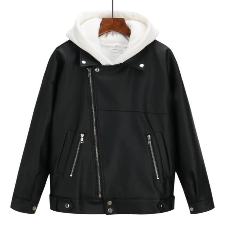 Women's wider faux leather jacket with pockets and zip fastening. Without a hooded sweatshirt.