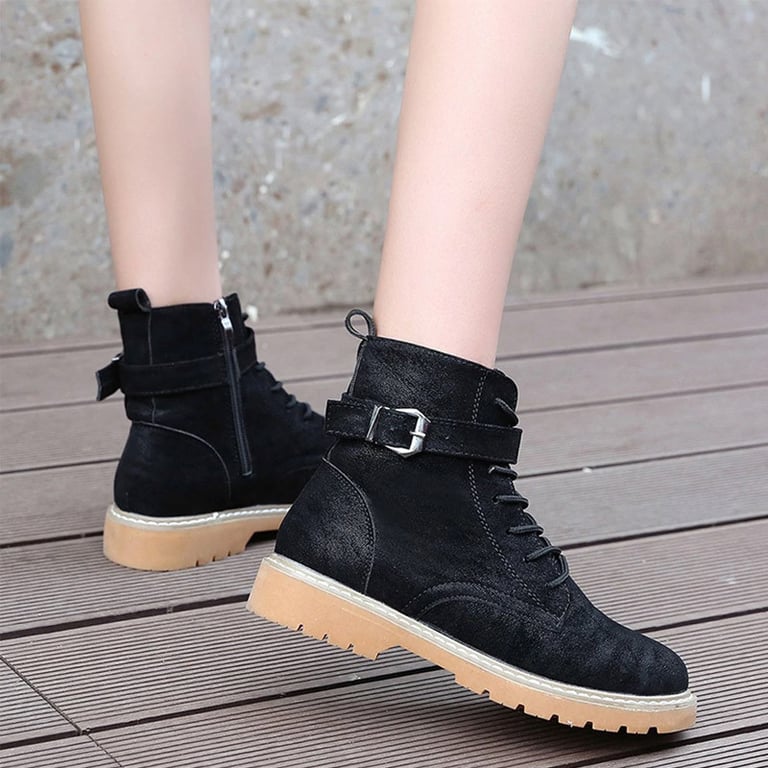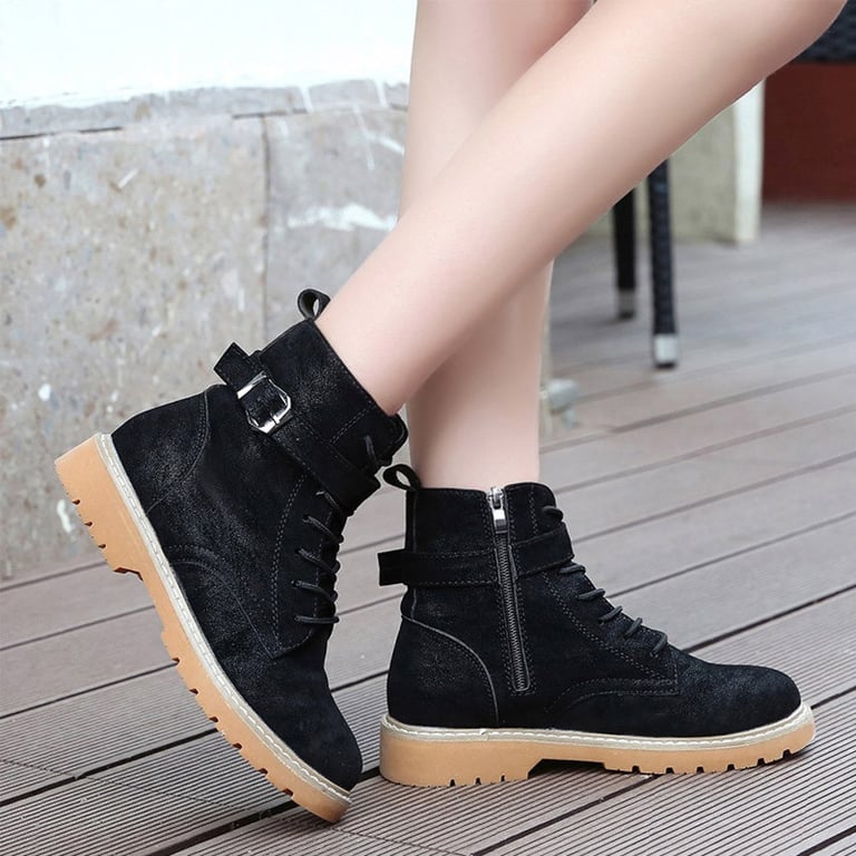 Women's winter boots with a leather look and lacing. The boots feature a zip fastening and are adorned with a buckle at the ankle. Available in several colour options.