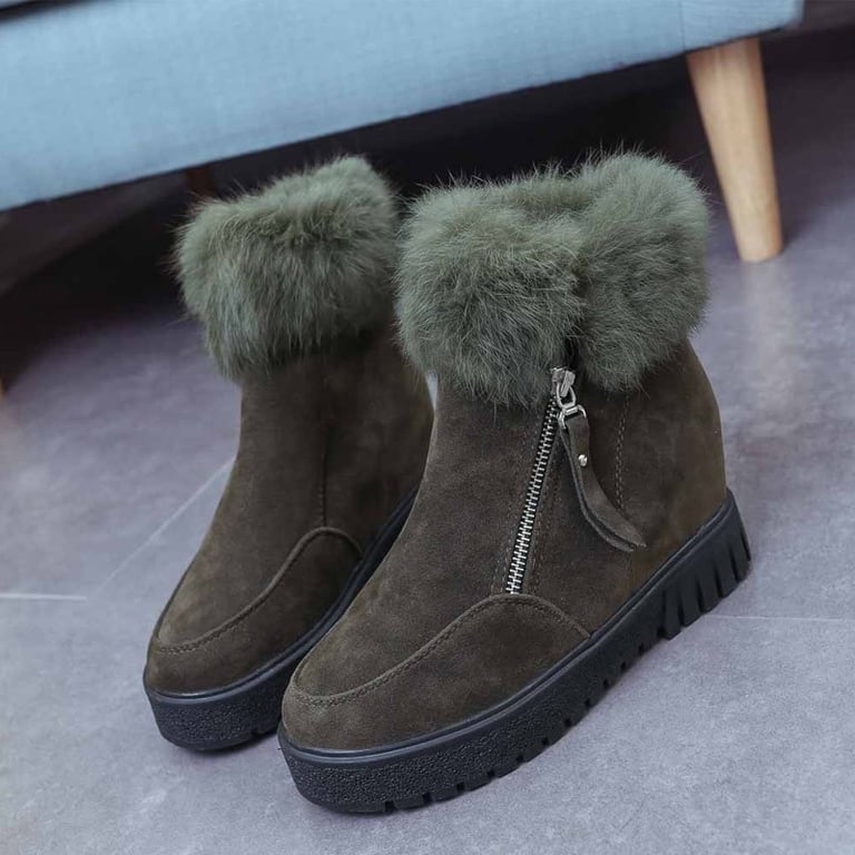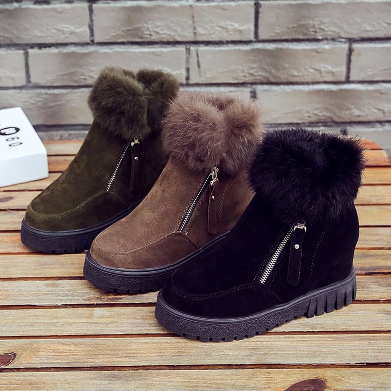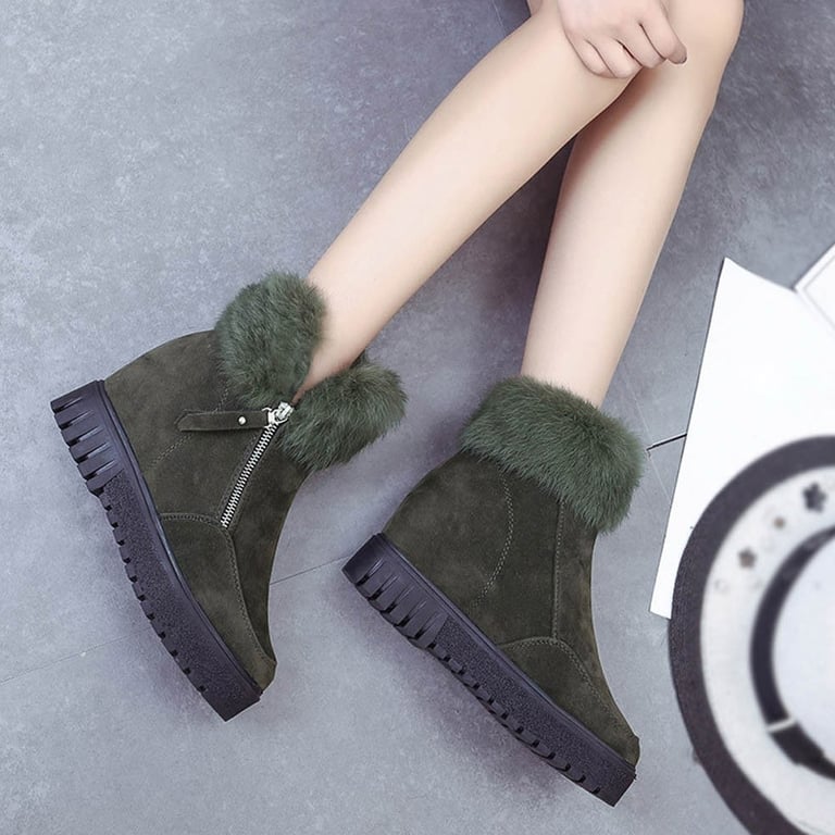 Women's winter ankle boots without a heel. The boots feature a rubber sole, a zip fastening, and are lined inside with warm fur. Available in three colours – black, green, brown.