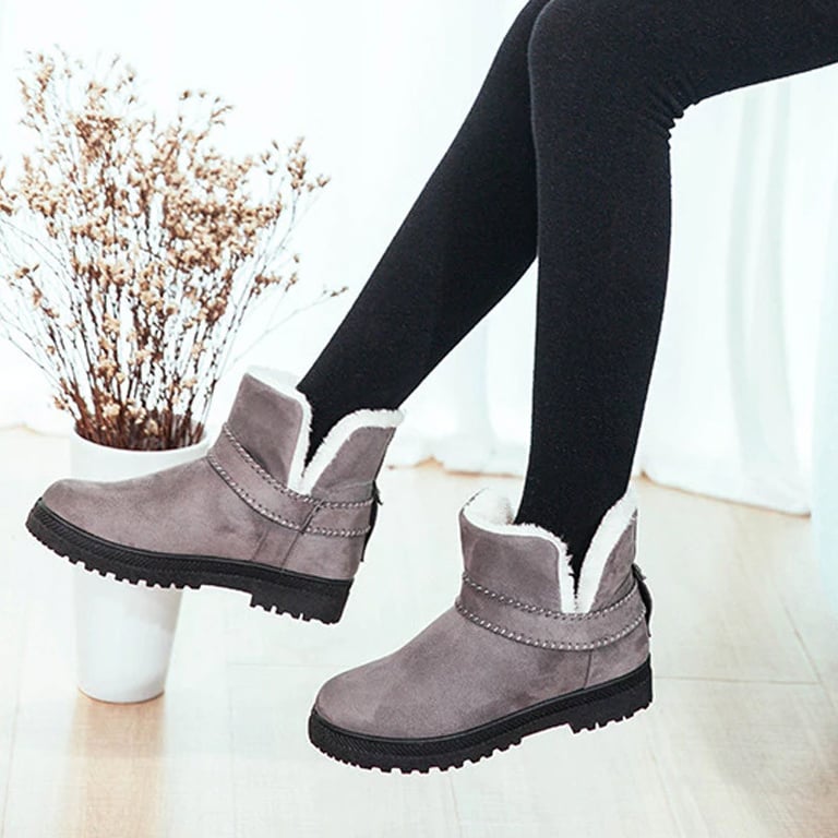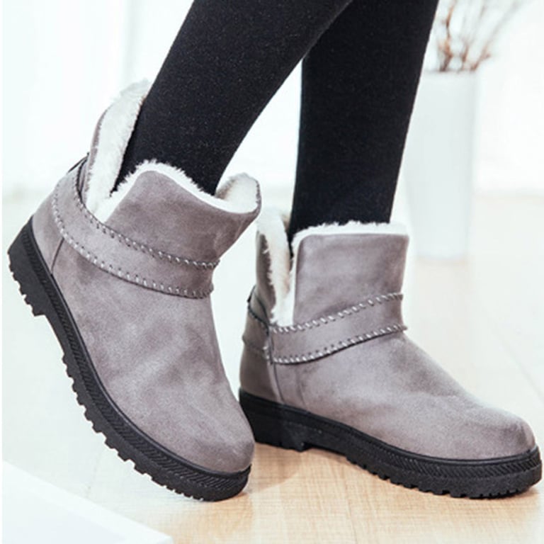 Women's winter ankle boots without a heel. The boots have a rubber sole with a textured pattern and are non-slip. They are lined with warm fur on the inside. Available in four colours.