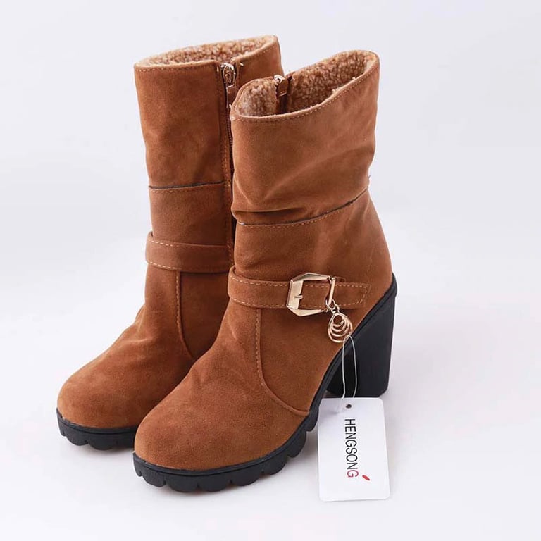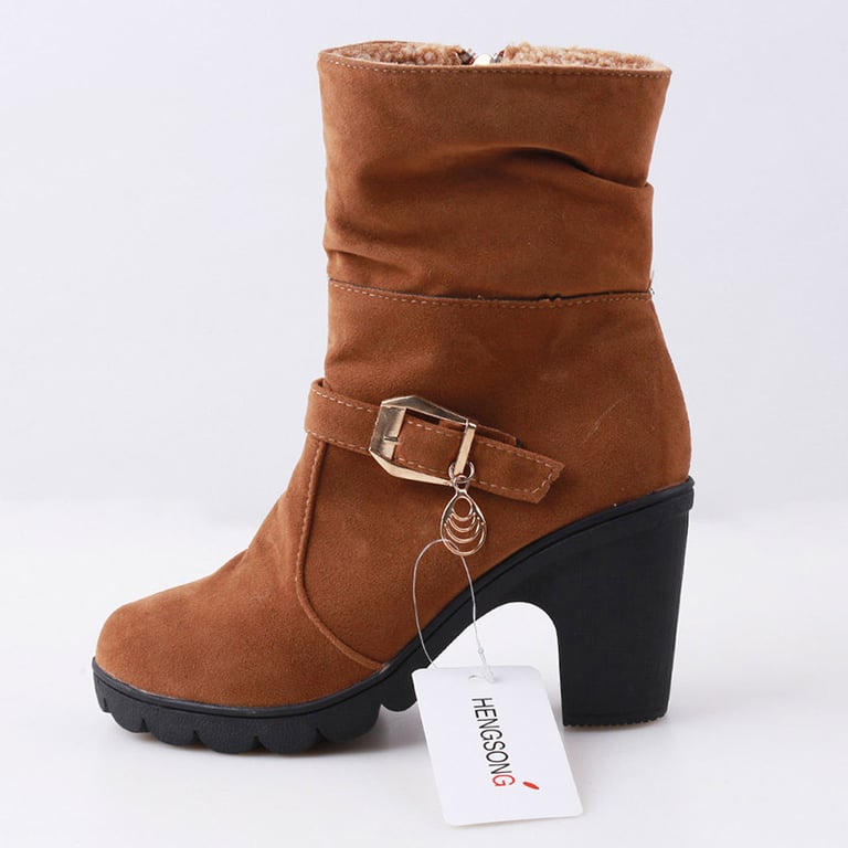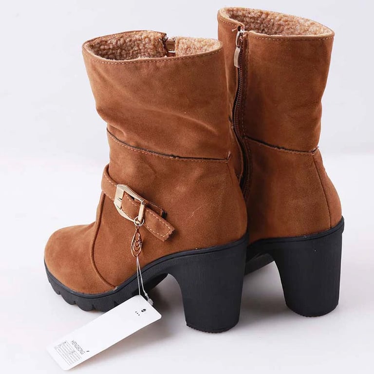 Women's low heeled ankle boots with a zip fastening on the inner side. The shoes are decorated with a buckle, have a sole with a ribbed pattern, and are lined with warm fur inside. Available in several colour options.