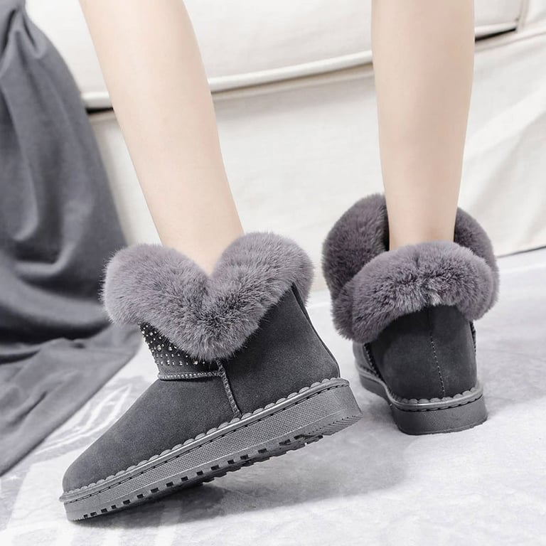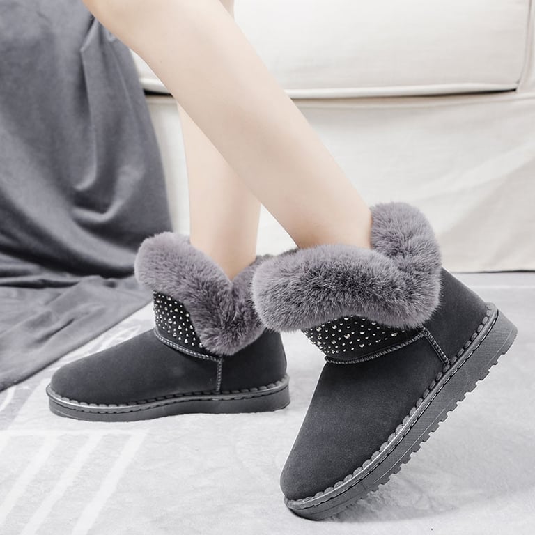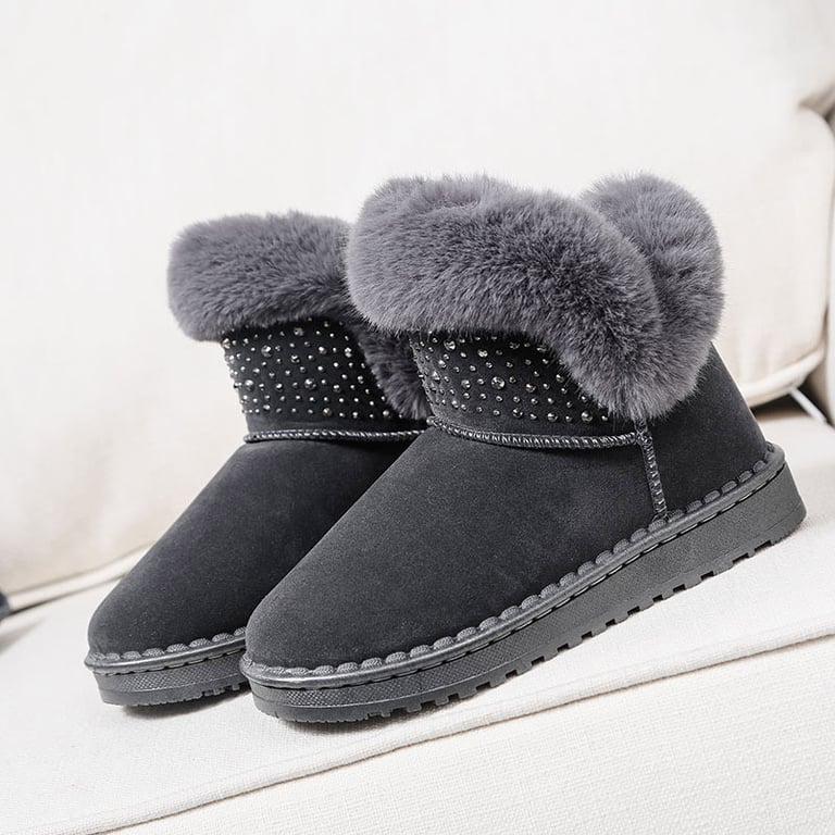 Women's winter ankle boots. The boots are insulated with a large warm fur lining and feature a rubber sole with a textured pattern. The front is decorated with small stones. Available in three colours – black, grey, khaki.
