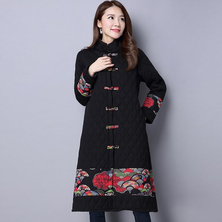 Comfortable quilted long coat for the winter season. The cut is very elegant, the print is subtle.
