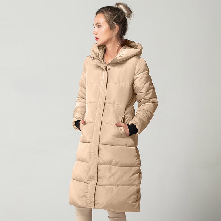 Women's long winter quilted coat with a hood. The coat features a zip fastening, elasticated sleeves, and two side pockets. Available in several colour options.