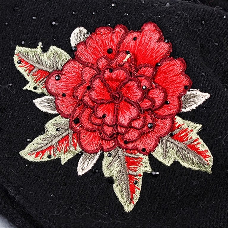 Beautiful warm women's hat with floral embroidery adorned with rhinestones.