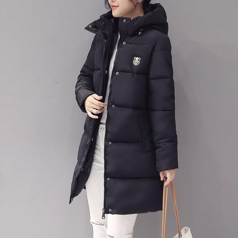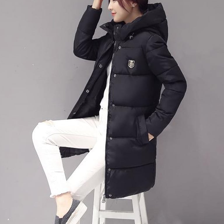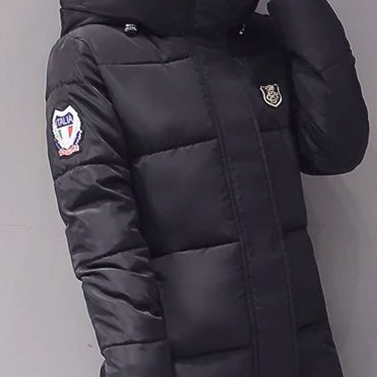 Long padded quilted winter coat with a hood and zip fastening. Enhanced with patches on the chest and sleeve. Available in six colour variations.