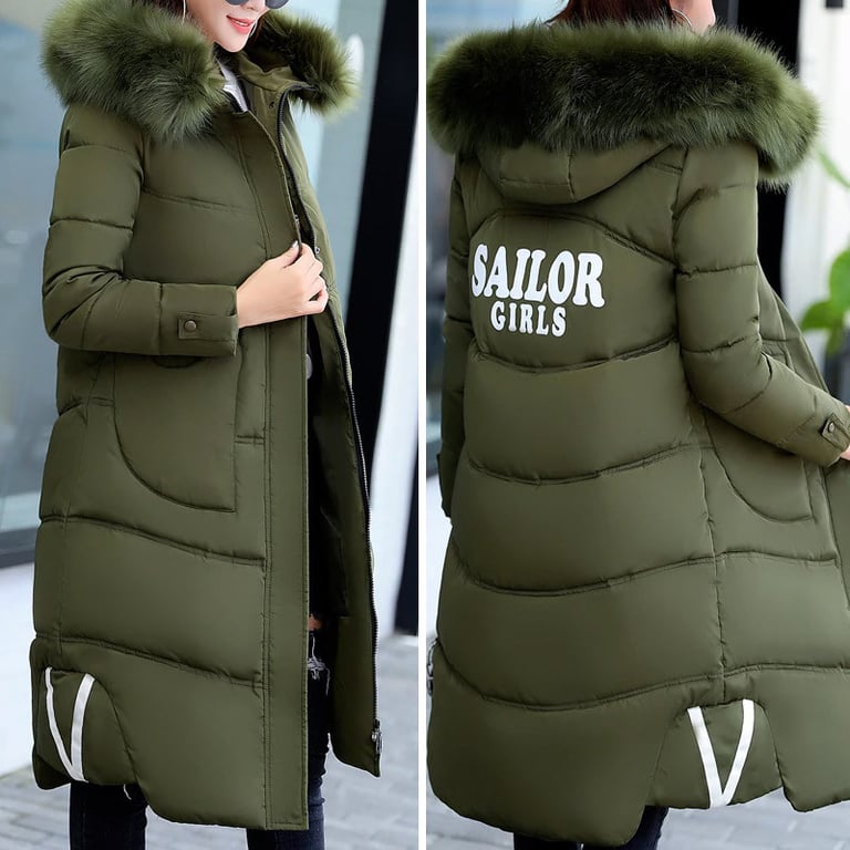 Women's long padded coat. The coat features a zip fastening, a hood with a large warm fur trim, and a print on the back. Available in several colour options.