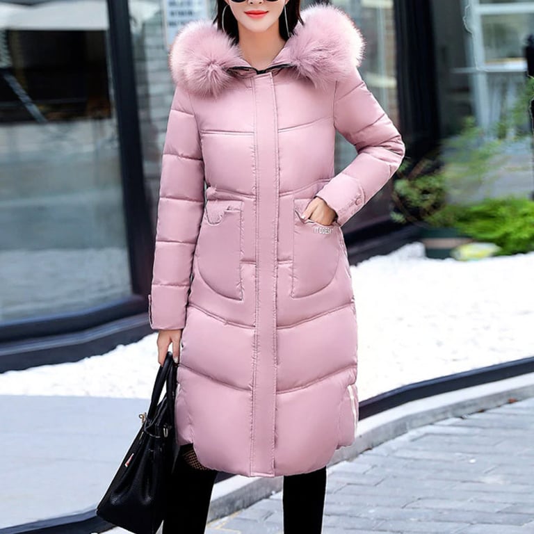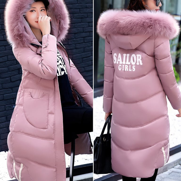 Women's long padded coat. The coat features a zip fastening, a hood with a large warm fur trim, and a print on the back. Available in several colour options.