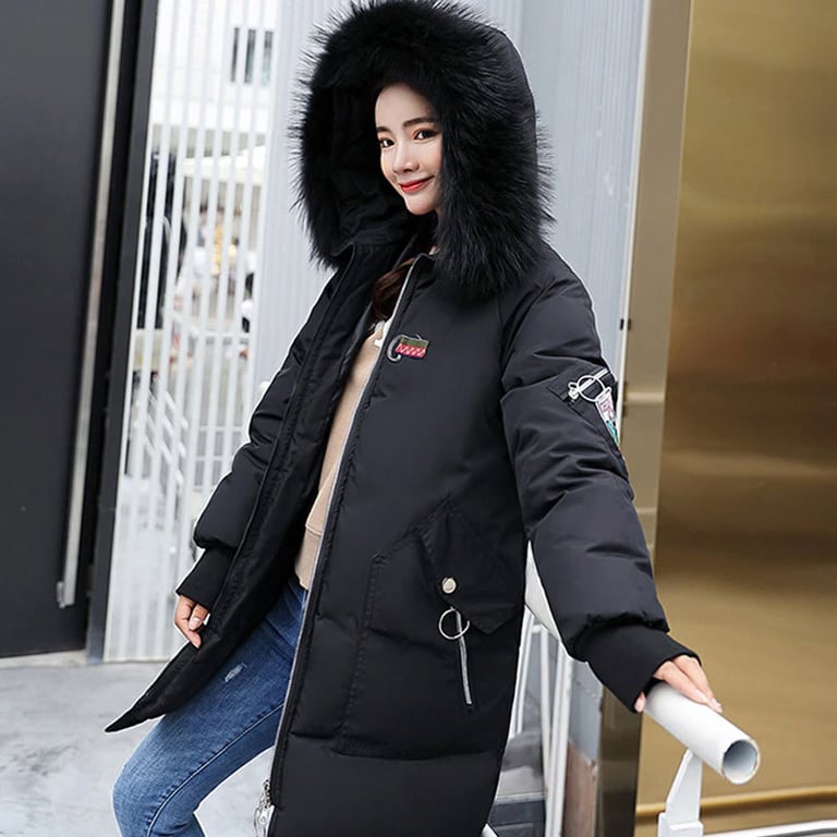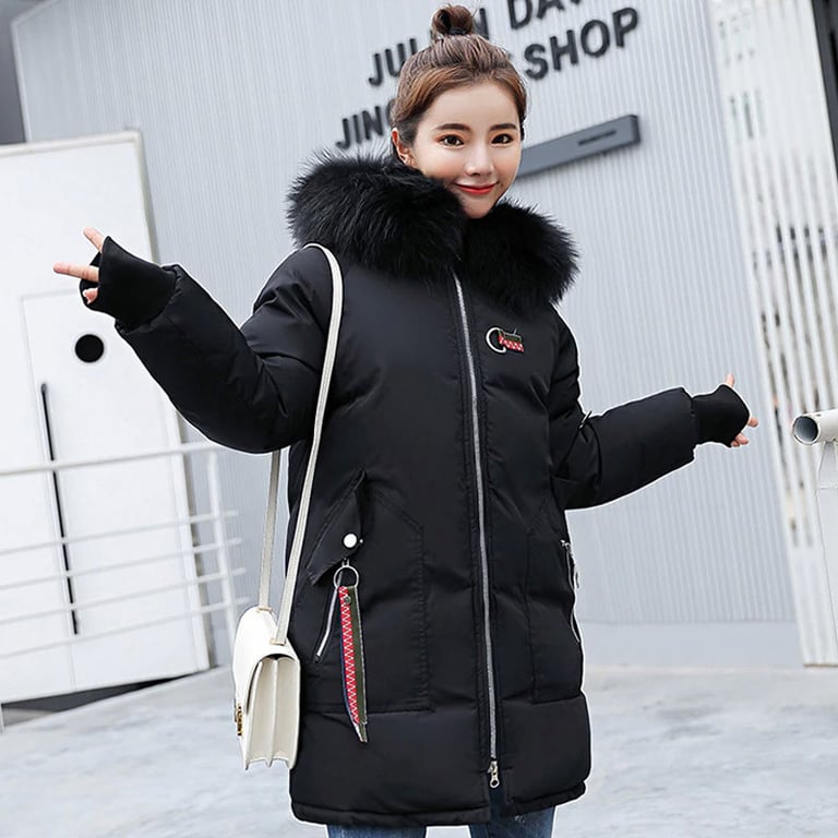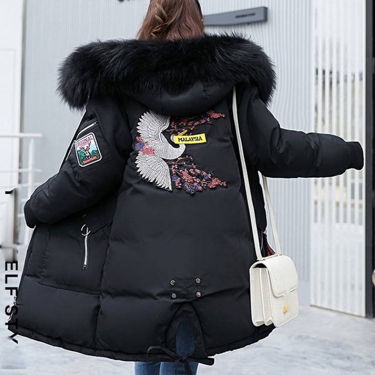Long winter padded coat with a zip fastening. The coat features a colourful print on the back, on the sleeve, and a large warm faux fur collar.