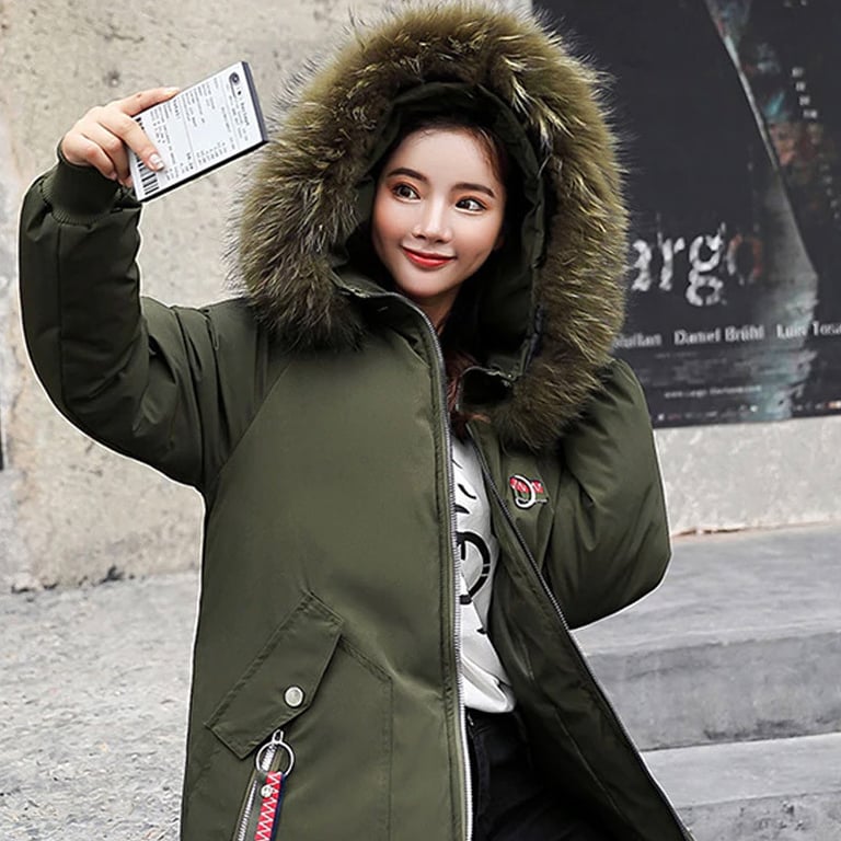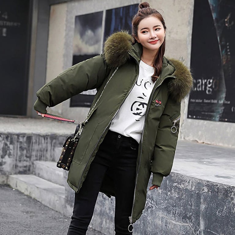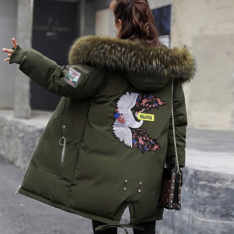 Long winter padded coat with a zip fastening. The coat features a colourful print on the back, on the sleeve, and a large warm faux fur collar.
