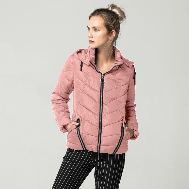 Women's lightweight quilted winter jacket with a hood. The jacket features a zip fastening, two side pockets, and decorative zips at the bottom. Available in several colour options.
