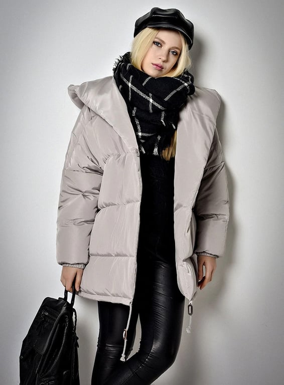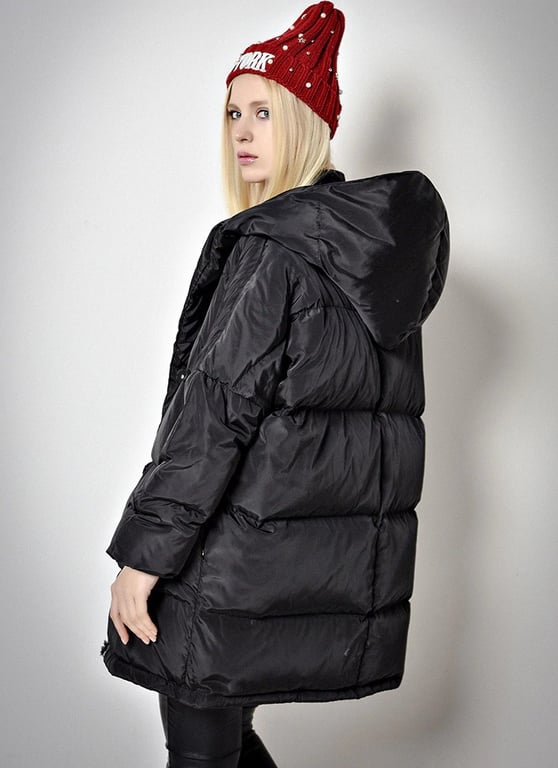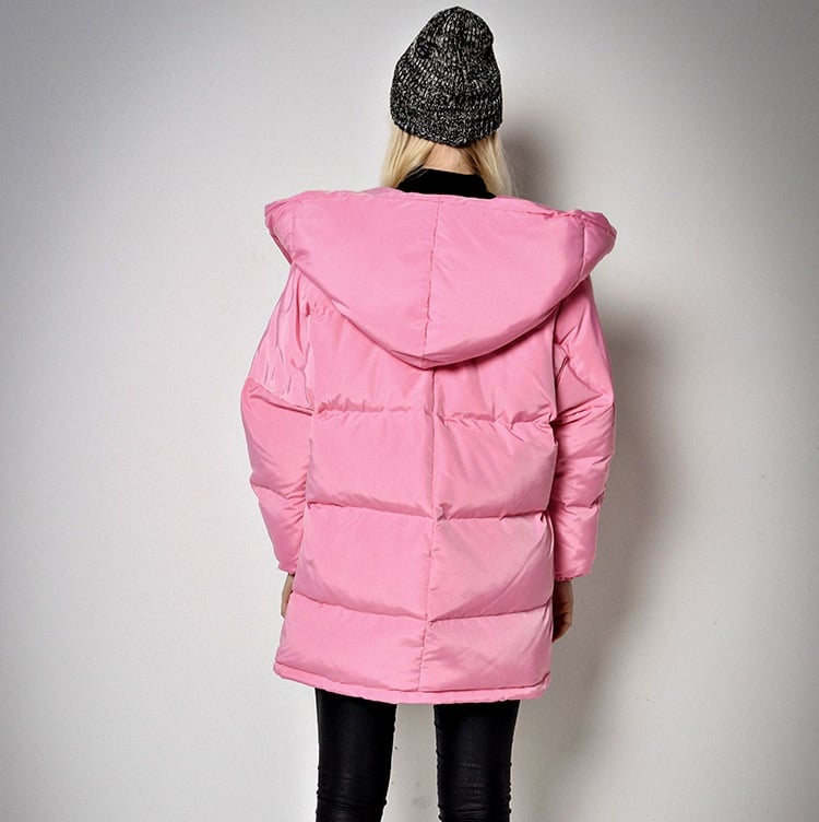 The women's down jacket with a large hood will surely keep you warm in cold weather.