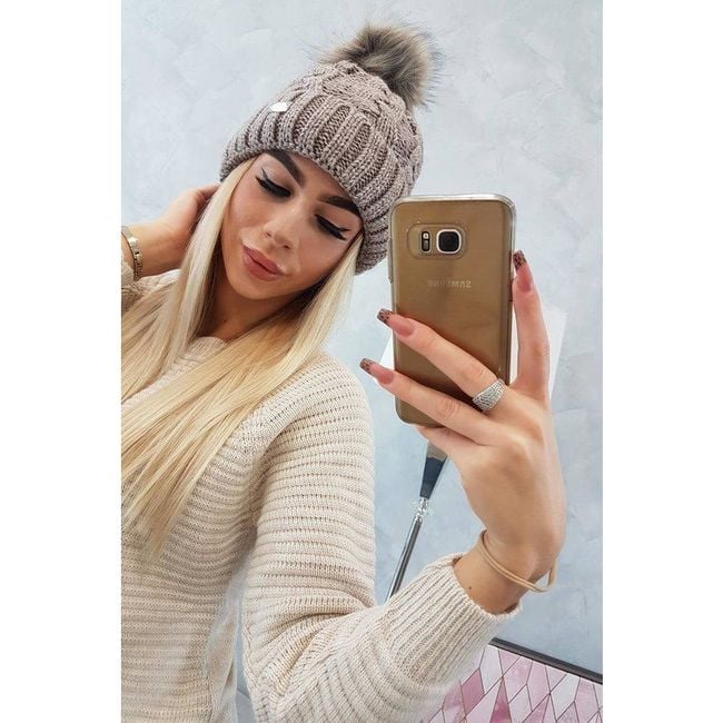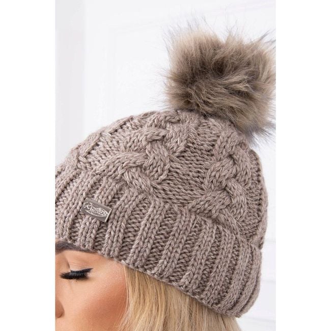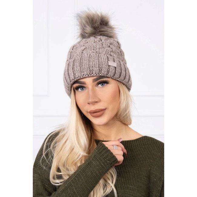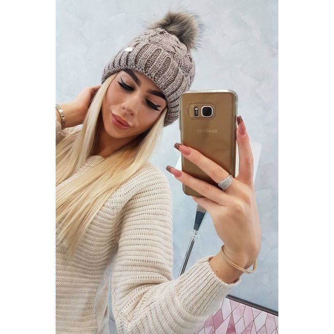 Ladies' winter knitted hat with pom-pom - grey