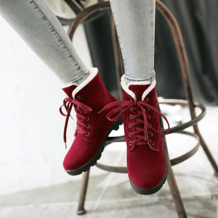 Women's ankle boots for winter with lacing. The boots feature a rubber sole with a textured pattern and are lined with fur for warmth. Available in three colour options – black, brown, and red.