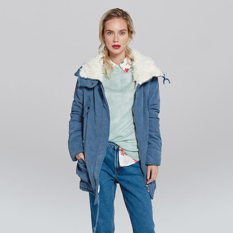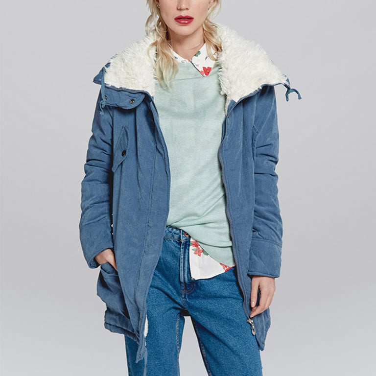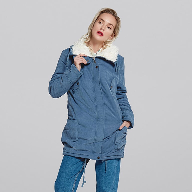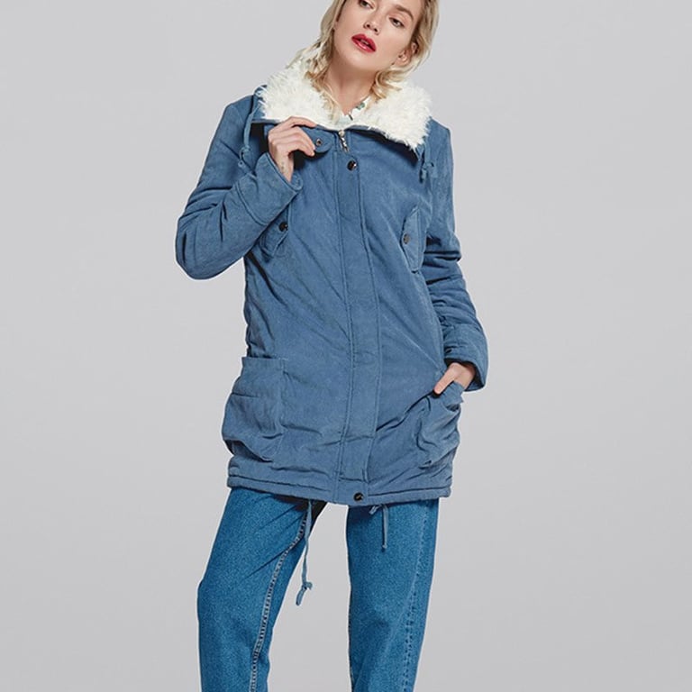 Women's winter jacket with a zip fastening. The jacket features a wide collar, two side pockets, and two chest pockets. It is lined with fur on the inside. Available in several colour options.