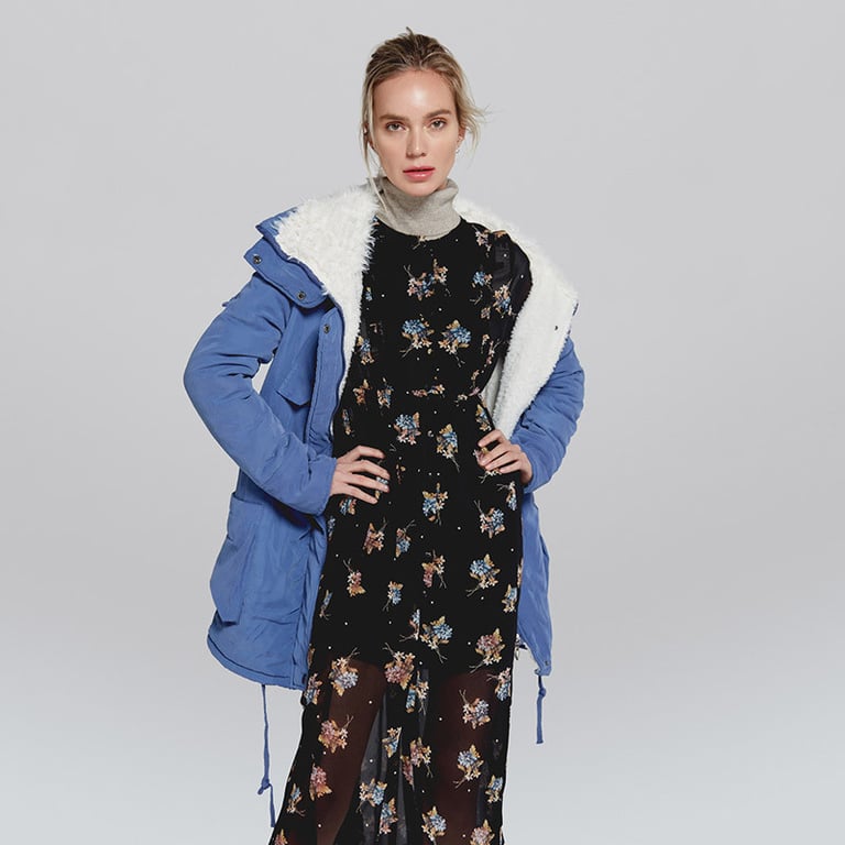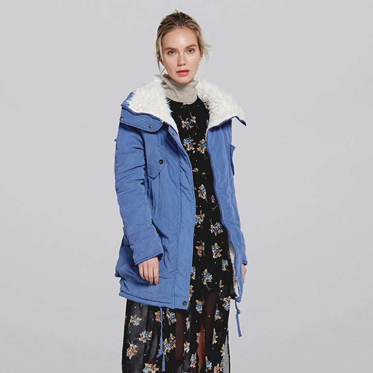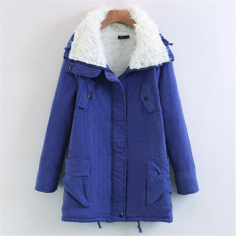 Women's winter jacket with a zip fastening. The jacket features a wide collar, two side pockets, and two chest pockets. It is lined with fur on the inside. Available in several colour options.