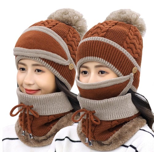 This very interesting women's knitted set consists of a hat, a neck warmer, and a face mask.