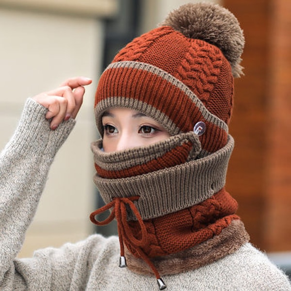 This very interesting women's knitted set consists of a hat, a neck warmer, and a face mask.