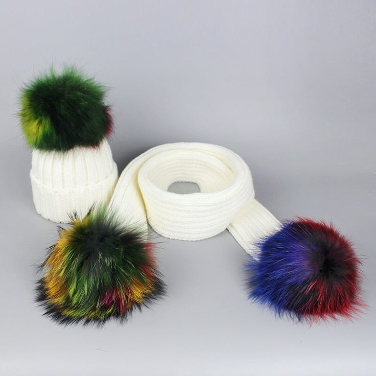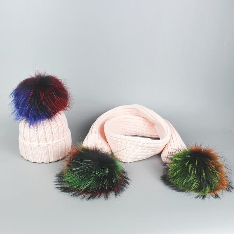 Winter set featuring a pom-pom hat and a scarf in the same colour scheme.