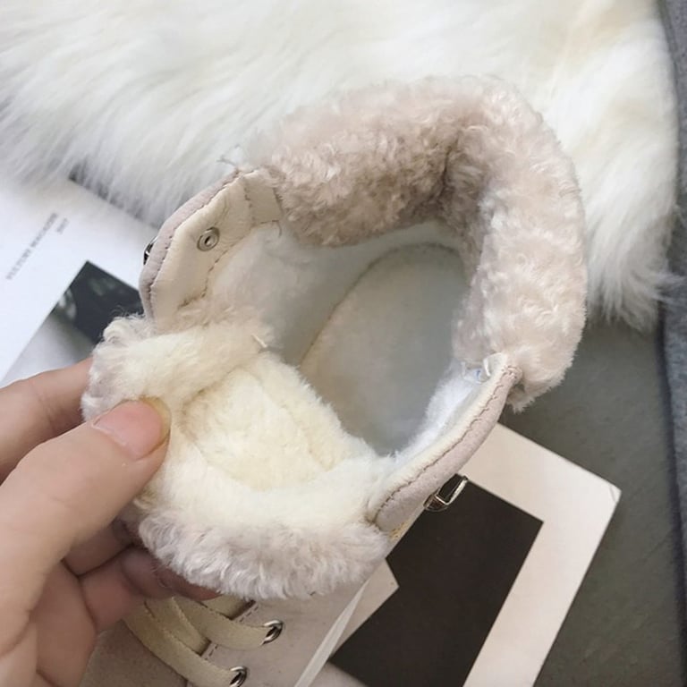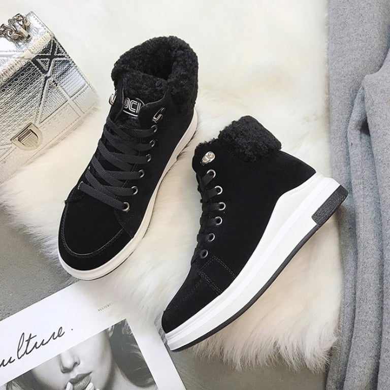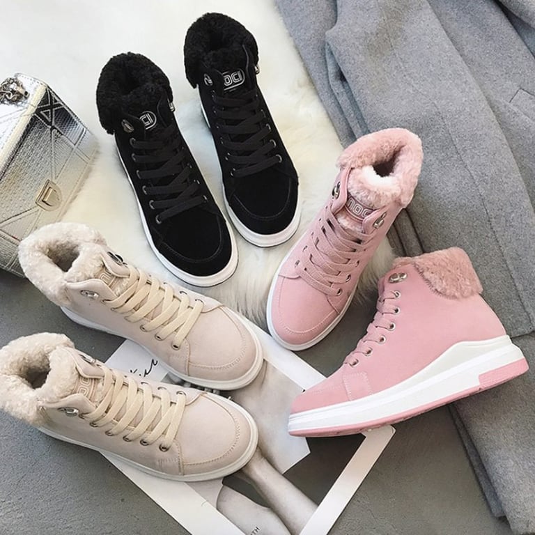 Women's winter ankle trainers with a warm fur lining. The shoes feature a rubber sole and lacing. They are available in several colour options – black, grey, pink.