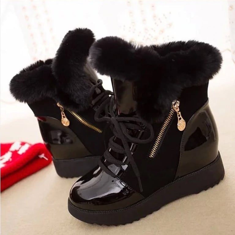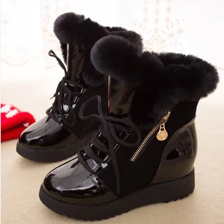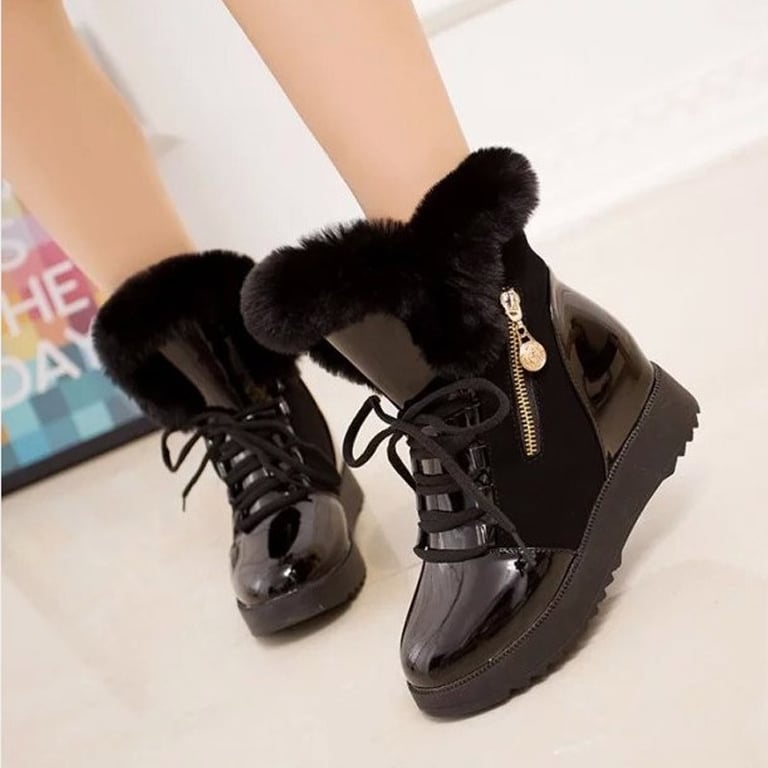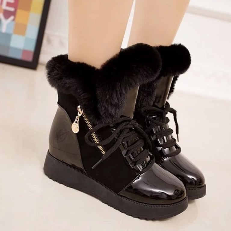 Women's winter ankle trainers with lacing. The trainers are on a platform, feature a zip fastening on the outer side, and are lined with faux fur. Available in two colour options.
