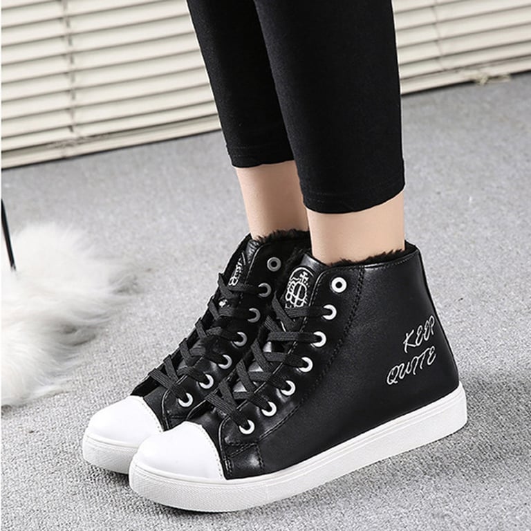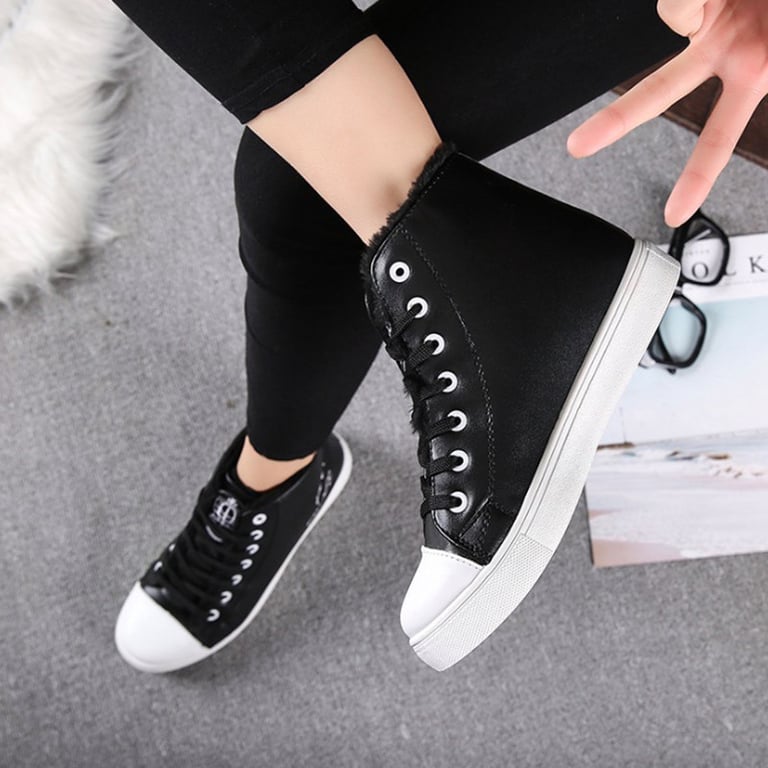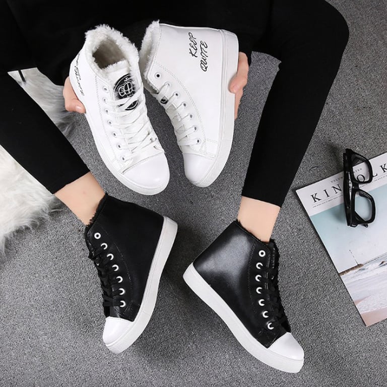 Women's winter boots with a leather-like appearance, featuring laces and a rubber sole. The boots have a warm lining with fur inside. Available in two colour options – white and black.