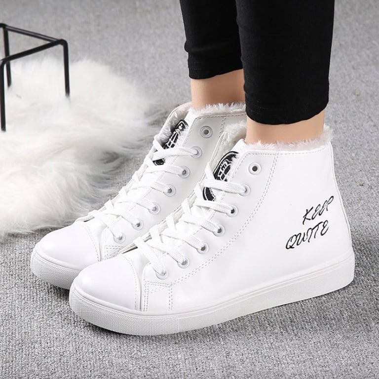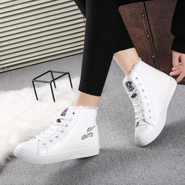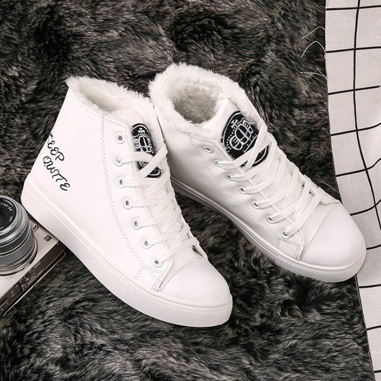 Women's winter boots with a leather look, featuring lacing and a rubber sole. The boots have a warm lining with fur inside. Available in two colour options – white and black.