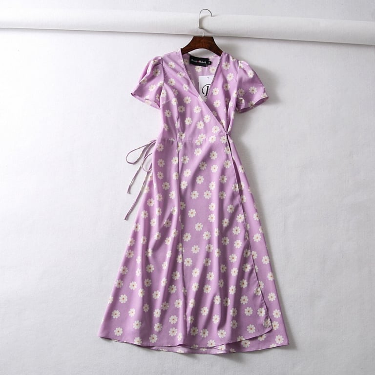 Women's lightweight wrap dress. Long cut with a tie at the waist. The dress has short sleeves and a V-neck. Available in several variants.