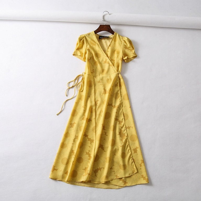 Women's lightweight wrap dress. Long cut with a tie at the waist. The dress has short sleeves and a V-neck. Available in several variations.
