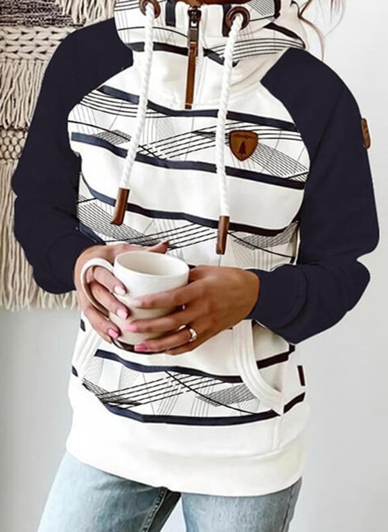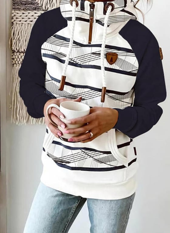 Women's zip-up hoodie with a high collar and kangaroo pocket featuring a striped design.