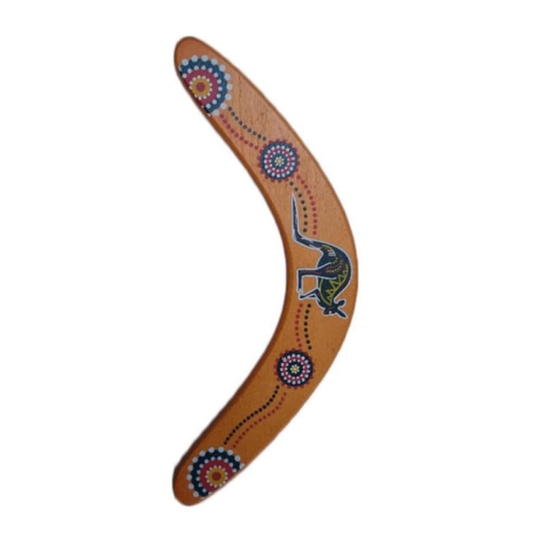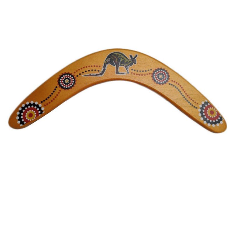 A wooden boomerang, when thrown correctly, will begin to rotate in an arc in the air due to its specially aerodynamic shape, eventually returning to the point of throw. Upon return, it should glide in a horizontal position.