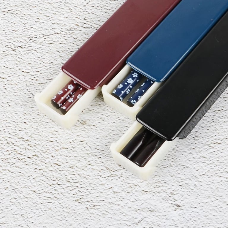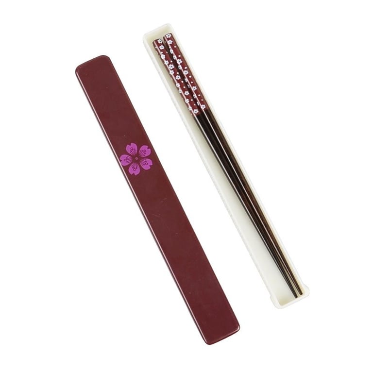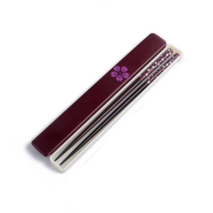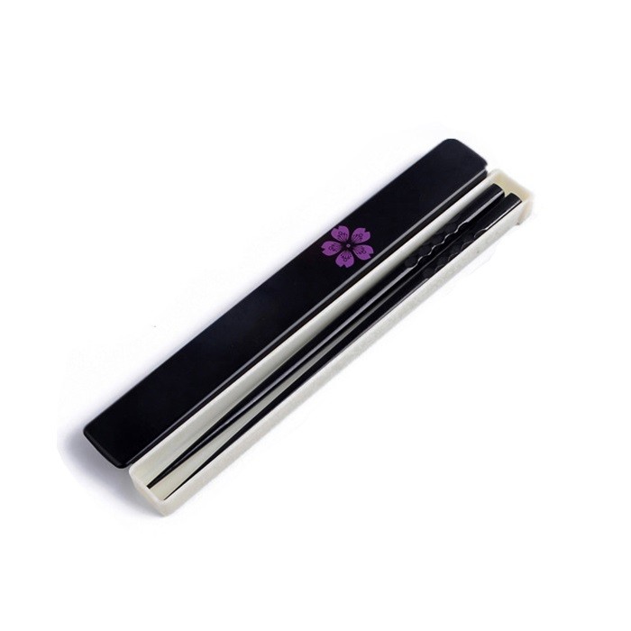 Traditional Chinese chopsticks with a decorative flower in a practical case.