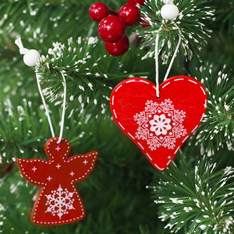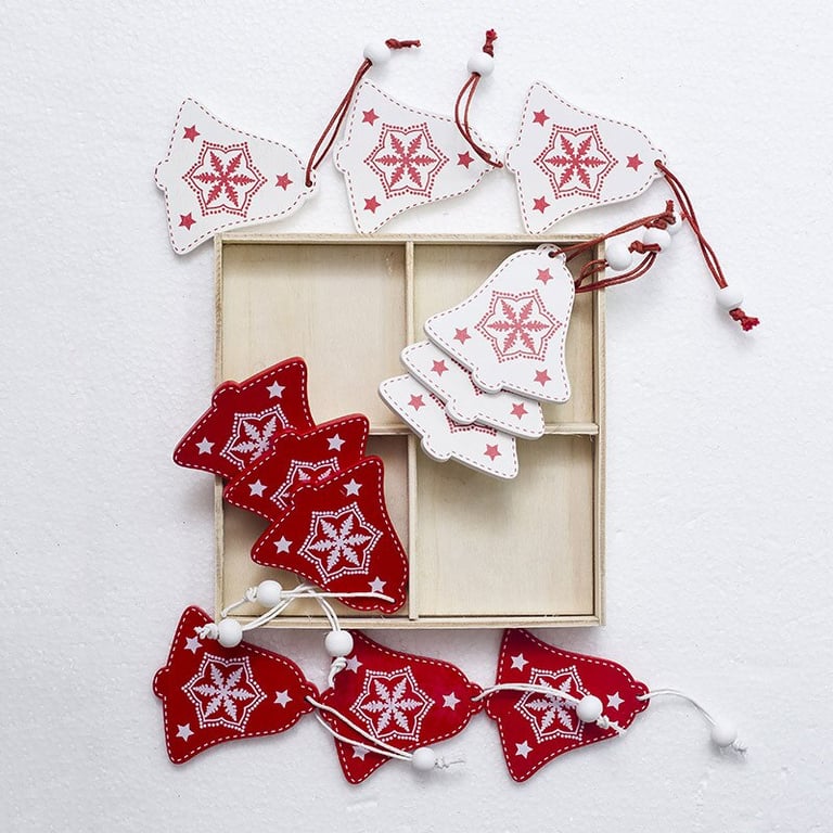 Beautifully painted wooden Christmas decorations in a red and white combination.