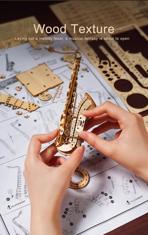 Wooden creative 3D puzzles in the shape of musical instruments.