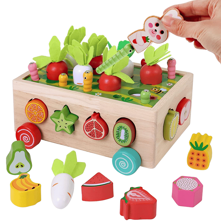 This game is ideal for supporting children's motor development. Children will love inserting wooden fruit-shaped pieces into holes and then removing magnetic caterpillars using a bunny with a magnet. This game, made from durable wood, will provide your child with hours of fun.
