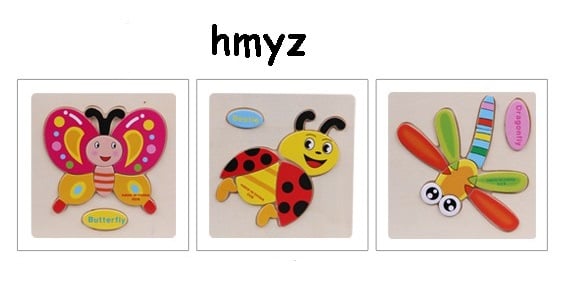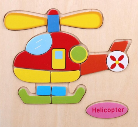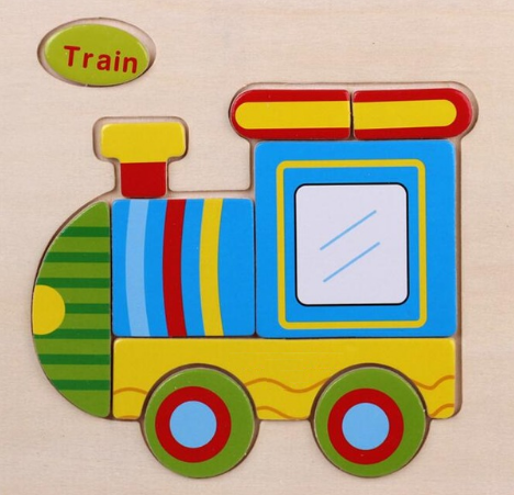 Wooden puzzles for children aged 3 and above. A stacking puzzle with cheerful pictures of animals, fruit, and vehicles with a template on the board.