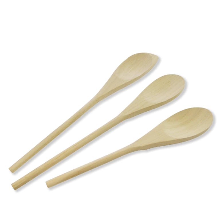 A set of 3 wooden spoons can be used for mixing salads or cooking.