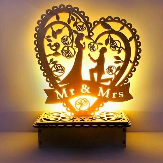 A lovely gift for married couples for the home. A glowing wooden decoration with the inscription MR&MRS and I LOVE YOU.
