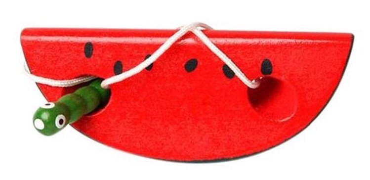 The melon threading toy with a worm is a wooden educational toy where the worm is threaded through holes in the apple.