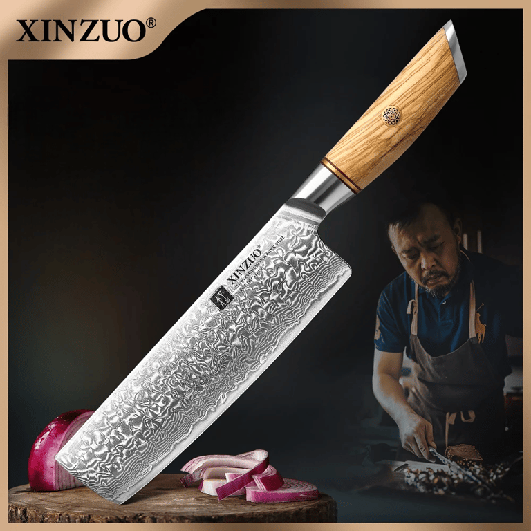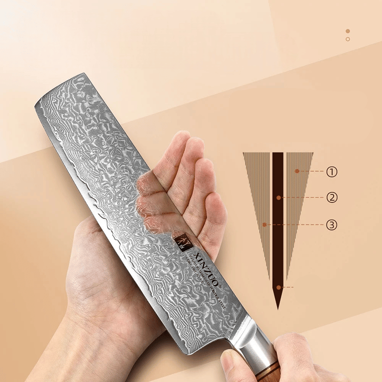 Professional Nakiri knife of the XINZUO brand is made from powdered Damascus steel, which provides extreme sharpness, hardness and an exceptionally attractive blade pattern. Thanks to the 18 cm length and wide blade, it is ideal for quick and precise slicing of vegetables, fruit and herbs.