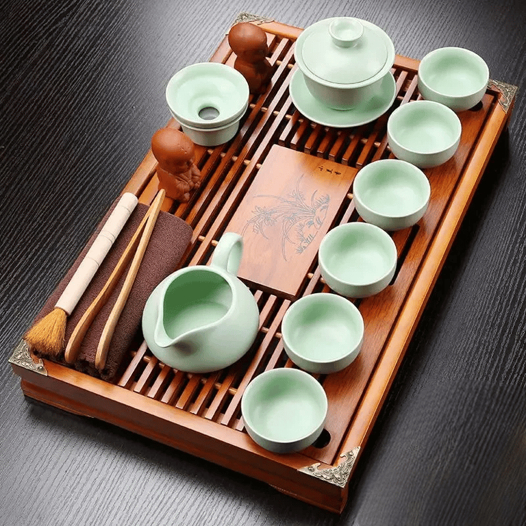 Ceramic Yixing tea set with a wooden tray. Luxurious Yixing tea set with a bamboo tray. It contains everything for a traditional tea ceremony. High-quality ceramic, an intricate design, and a premium feel in every sip of tea.