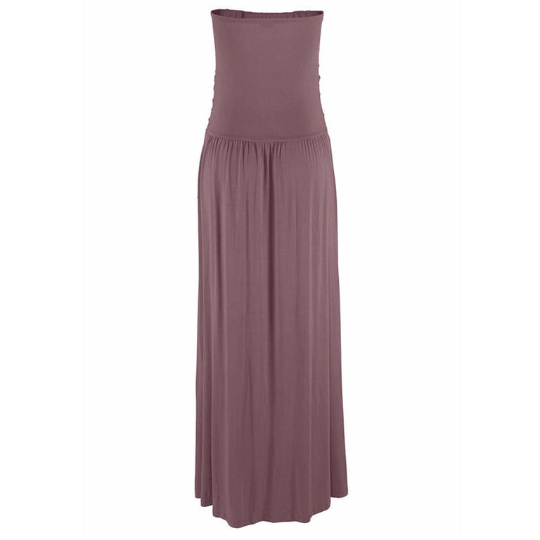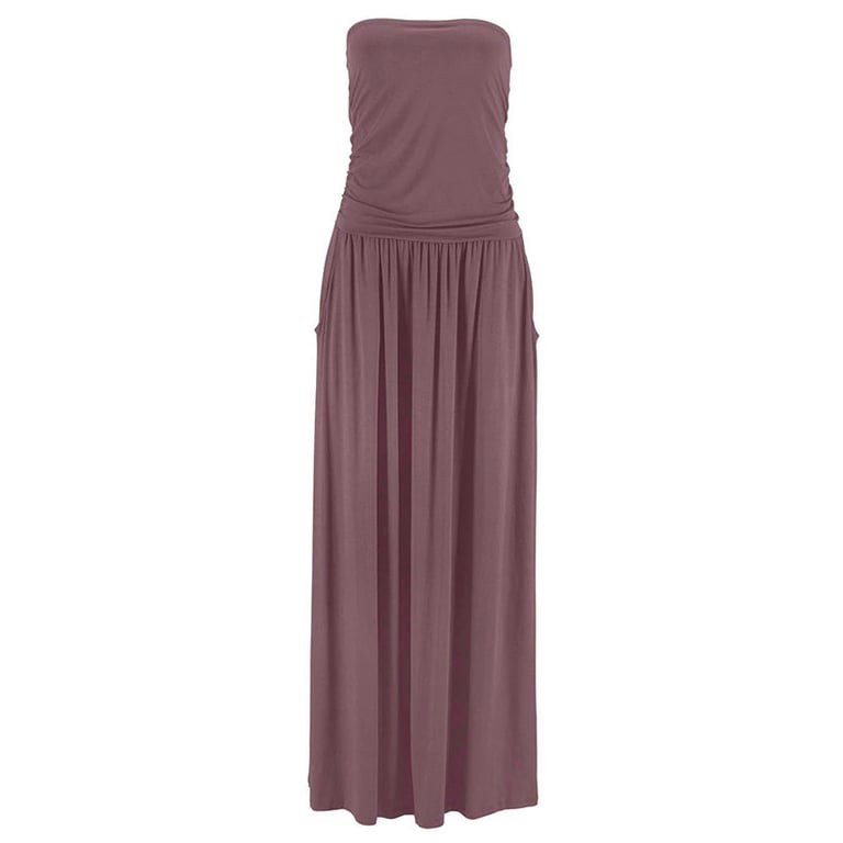 Women's dress with exposed shoulders and a long flowing skirt with pockets. Available in multiple colour options.